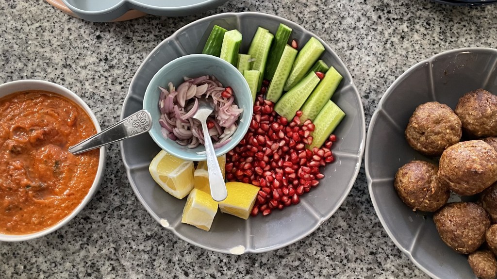 I also did a little salad with red onion soaked in some pomegranate molasses, cucumber, and pomegranate.